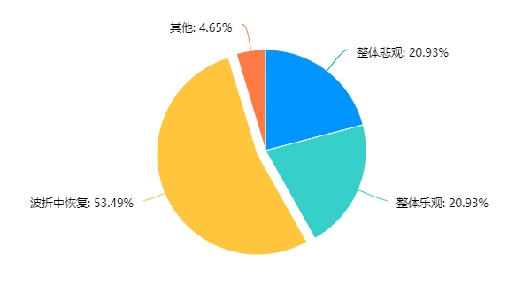 選擇整體悲觀的為9家,占比為20.93%;選擇整體樂觀的為9家,占比為20.93%;選擇波折中恢復(fù)的為23家,占比為53.49%;選擇其他的為2家,占比為4.65%,分別填寫的為:不確定因素多;看不準(zhǔn)。