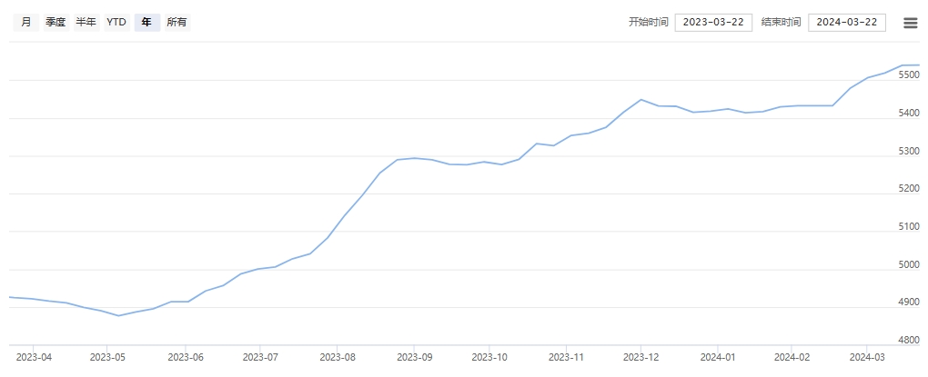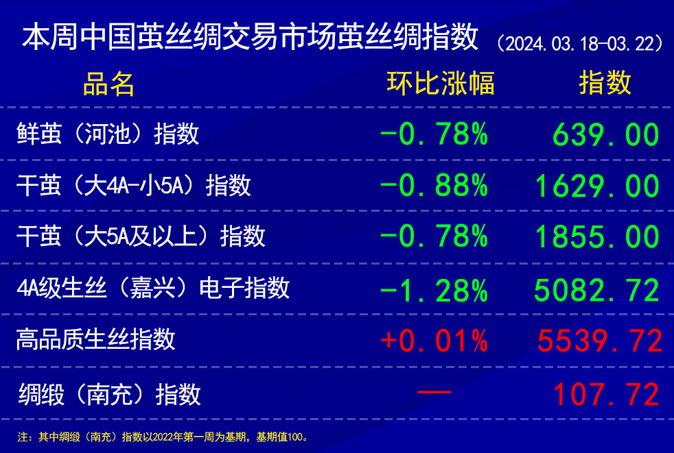 今日(2024年03月22日,周五)中國繭絲綢交易市場生絲指數(shù)微跌0.09%收于5082.72點,本周生絲指數(shù)下跌1.28%。B絲(商檢4A級生絲):240325合約下跌0.06萬元報收于52.53萬元;240925合約上漲0.15萬元報收于49.08萬元;250325合約下跌0.12萬元報收于49.29萬元。