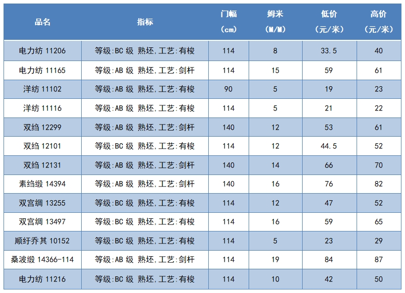 本周綢緞指數(shù)協(xié)作單位成交價格區(qū)間