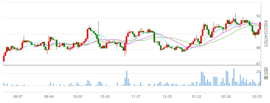 今日(2024年03月27日,周三)中國(guó)繭絲綢交易市場(chǎng)生絲指數(shù)上漲0.31%收于4978.02點(diǎn)。B絲(商檢4A級(jí)生絲):240425合約報(bào)平收于49.59萬(wàn)元;240925合約上漲0.45萬(wàn)元報(bào)收于49.71萬(wàn)元;250325合約上漲0.72萬(wàn)元報(bào)收于50.07萬(wàn)元。