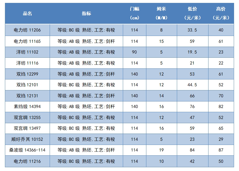 本周綢緞指數(shù)協(xié)作單位成交價格區(qū)間
