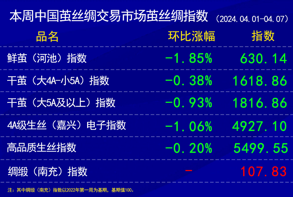 本周處于清明小長假,7天時間實際為4個交易日。周一在廣東鮮繭搶購帶動下,生絲指數(shù)收紅,周二和周三略下跌,小長假期間廣西春繭上市面有所增大,周日生絲指數(shù)下跌較深。本周4A級生絲指數(shù)累計下跌1.06%,整體上處于春繭規(guī)模上市前的波動期。