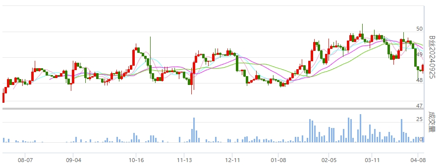 今日(2024年04月10日,周三)中國繭絲綢交易市場生絲指數(shù)微跌0.04%收于4895.25點。B絲(商檢4A級生絲):240425合約下跌0.09萬元報收于48.75萬元;240925合約上漲0.24萬元報收于48.72萬元;250325合約上漲0.12萬元報收于48.99萬元。