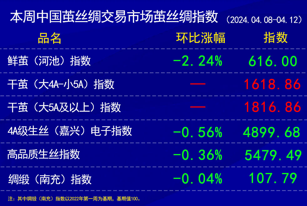 鮮繭指數(shù)上,本周采樣點為廣西和廣東兩省,根據(jù)協(xié)作單位所報,本周指數(shù)環(huán)比上周有所下跌。