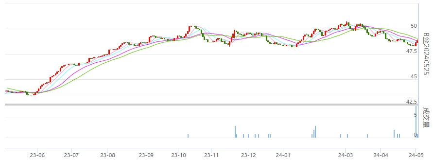 今日(2024年05月06日,周一)中國(guó)繭絲綢交易市場(chǎng)生絲指數(shù)上漲0.60%報(bào)于4910.15點(diǎn)。B絲(商檢4A級(jí)生絲):240525合約上漲0.18萬(wàn)元報(bào)收于48.84萬(wàn)元;240925合約上漲0.15萬(wàn)元報(bào)收于49.17萬(wàn)元;250325合約上漲0.30萬(wàn)元報(bào)收于49.44萬(wàn)元。