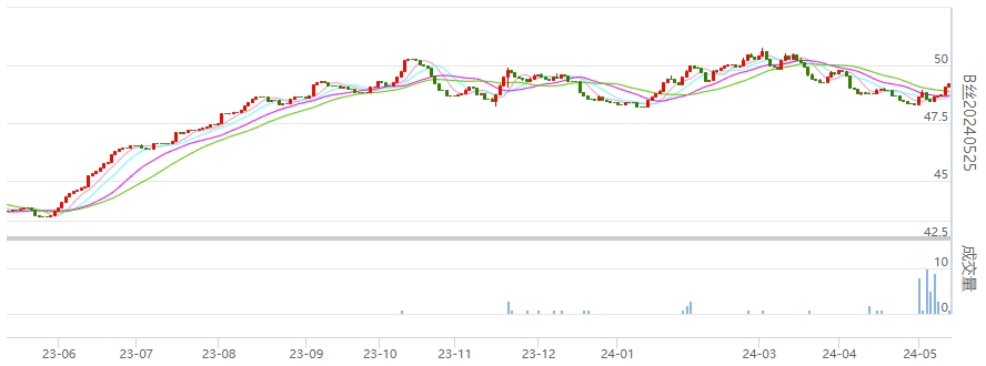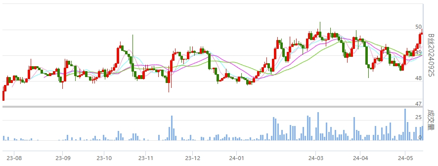 今日(2024年05月14日,周二)中國繭絲綢交易市場生絲指數(shù)上漲0.39%報(bào)于4967.13點(diǎn)。B絲(商檢4A級(jí)生絲):240525合約上漲0.15萬元報(bào)收于49.23萬元;240925合約上漲0.06萬元報(bào)收于49.89萬元;250325合約上漲0.27萬元報(bào)收于50.25萬元。