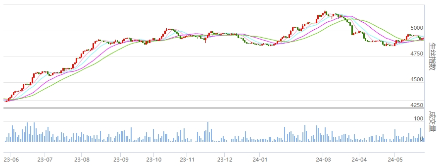 今日(2024年05月27日,周一)中國繭絲綢交易市場生絲指數(shù)微漲0.03%報于4928.04點。B絲(商檢4A級生絲):240625合約上漲0.03萬元報收于48.84萬元;240925合約報平收于49.35萬元;250325合約報平收于49.98萬元。