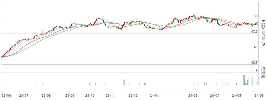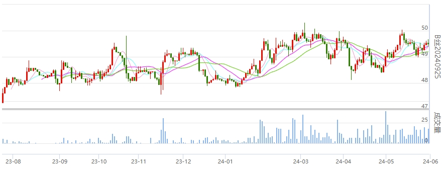 今日(2024年05月31日,周五)中國繭絲綢交易市場生絲電子指數(shù)上漲0.08%報于4964.69點,本周生絲電子指數(shù)上漲0.77%,本月生絲指數(shù)上漲1.72%。B絲(商檢4A級生絲):240625合約下跌0.03萬元報收于49.20萬元;240925合約下跌0.03萬元報收于49.50萬元;250325合約上漲0.12萬元報收于50.31萬元。