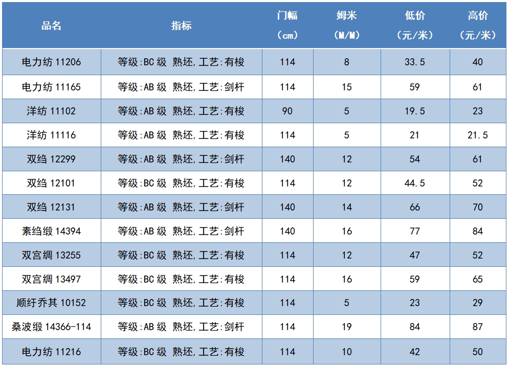 本周綢緞指數(shù)協(xié)作單位成交價格區(qū)間