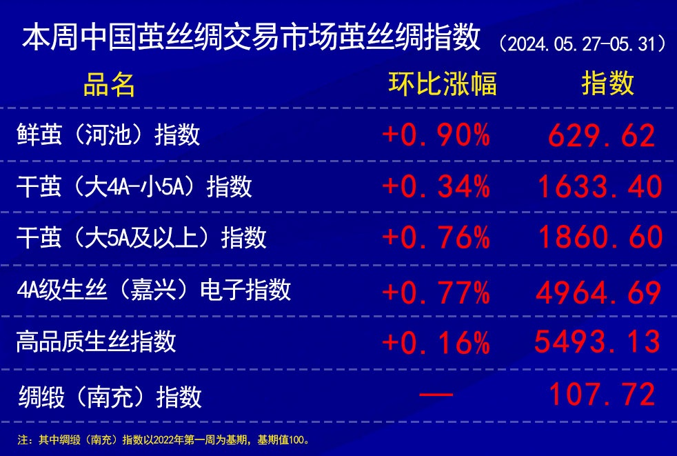 高品質(zhì)生絲指數(shù)上,環(huán)比上周,本周協(xié)作單位所報筆數(shù)一般,各個工廠依據(jù)質(zhì)量的成交價格相差不大,但工廠間價格有所拉大。部分高品質(zhì)生絲工廠全廠員工忙于收購春繭。本周高品質(zhì)生絲指數(shù)報于5493.13略收紅。