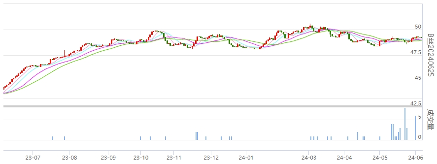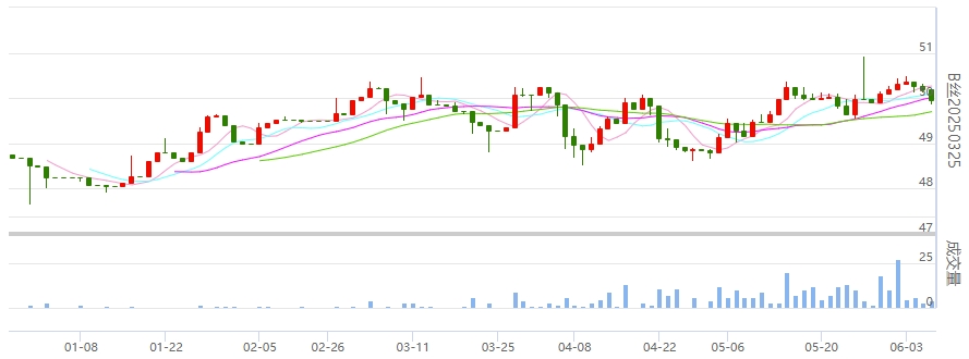 今日(2024年06月06日,周四)中國繭絲綢交易市場生絲電子指數(shù)下跌0.26%報于4947.60點。B絲(商檢4A級生絲):240625合約下跌0.06萬元報收于49.23萬元;240925合約下跌0.06萬元報收于49.35萬元;250325合約下跌0.24萬元報收于49.95萬元。