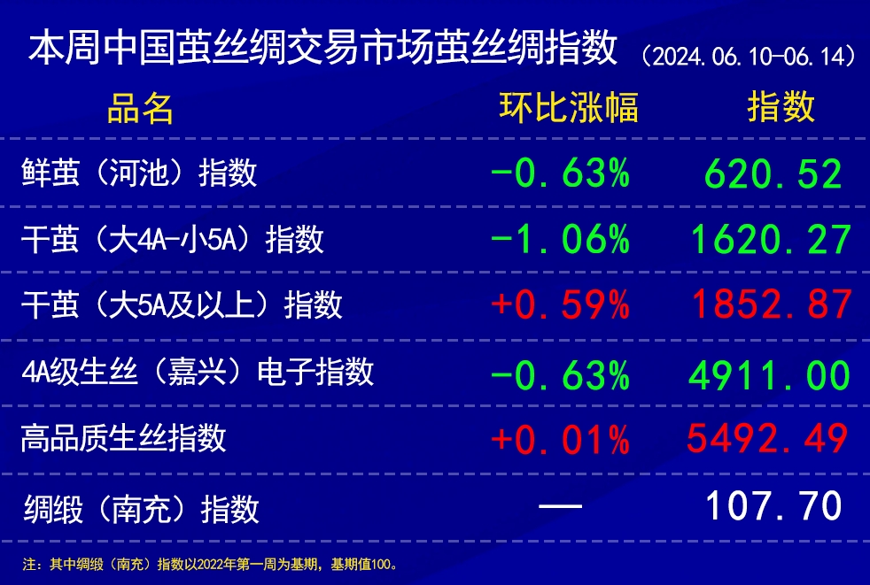 鮮繭指數(shù)上,本周廣西春夏繭收購價格環(huán)比上周有下調(diào),同時由于夏季因素質(zhì)量轉(zhuǎn)差;同時繼續(xù)跨區(qū)收購。本周指數(shù)環(huán)比上周下跌0.63%報620.52點。