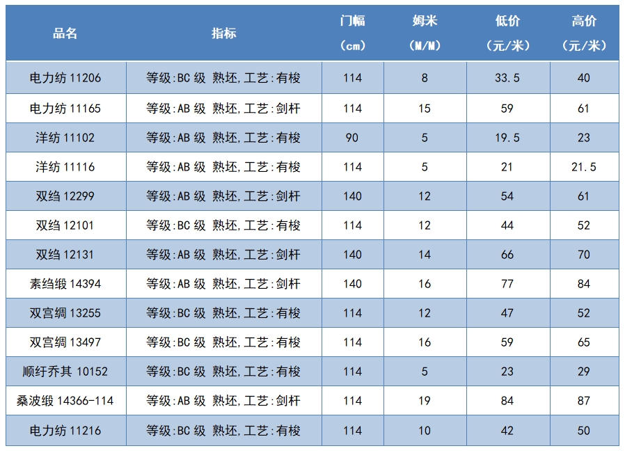 本周綢緞指數(shù)協(xié)作單位成交價格區(qū)間