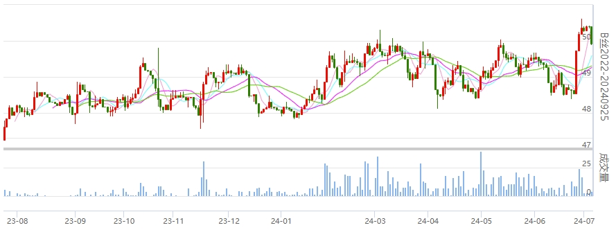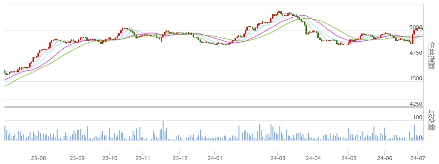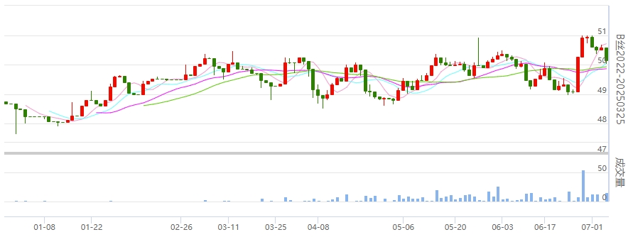 今日(2024年07月04日,周四)中國繭絲綢交易市場生絲電子指數(shù)下跌0.24%報(bào)5010.99點(diǎn)。B絲2022D(商檢4A級生絲):240725合約下跌0.06萬元報(bào)收于50.22萬元;240925合約下跌0.48萬元報(bào)收于49.92萬元;250325合約下跌0.42萬元報(bào)收于50.16萬元。B絲40/44-240725合約報(bào)平收48.42萬元;A絲20/22-240725合約上漲0.03萬元報(bào)51.75萬元。(更多行情詳情到首頁進(jìn)行查看)