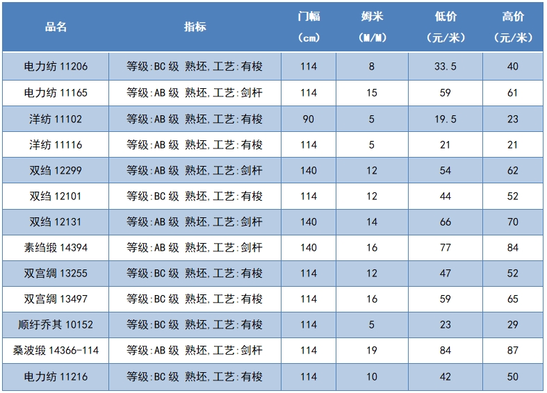 本周綢緞指數(shù)協(xié)作單位成交價(jià)格區(qū)間
