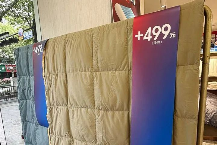 在水星家紡各門店,“以舊換新”、“舊物當(dāng)錢花”、“總部補貼以舊換新”,等等的宣傳標(biāo)語非常醒目,幾乎所有的產(chǎn)品都參與以舊換新活動。