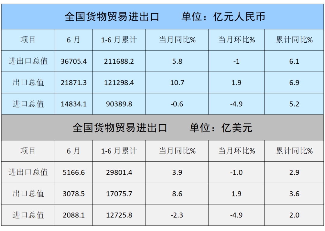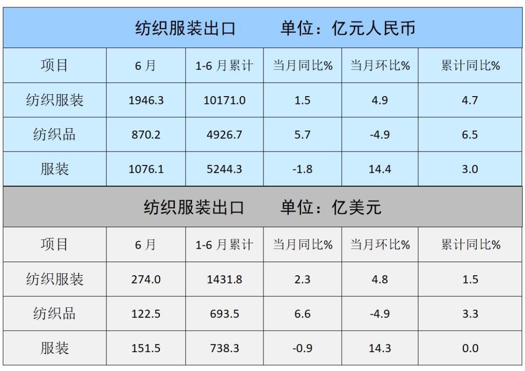 我們?cè)倏聪峦诘募徔椃b和貨物貿(mào)易的出口數(shù)據(jù)。上半年,我國(guó)紡織服裝累計(jì)出口1431.8億美元,同比增長(zhǎng)1.5%,其中,紡織品出口增長(zhǎng)3.3%,服裝出口與去年持平。按月度看,出口數(shù)據(jù)在經(jīng)歷1-2月兩位數(shù)增長(zhǎng)和3月下滑后逐步企穩(wěn),5月、6月同比恢復(fù)增長(zhǎng)。