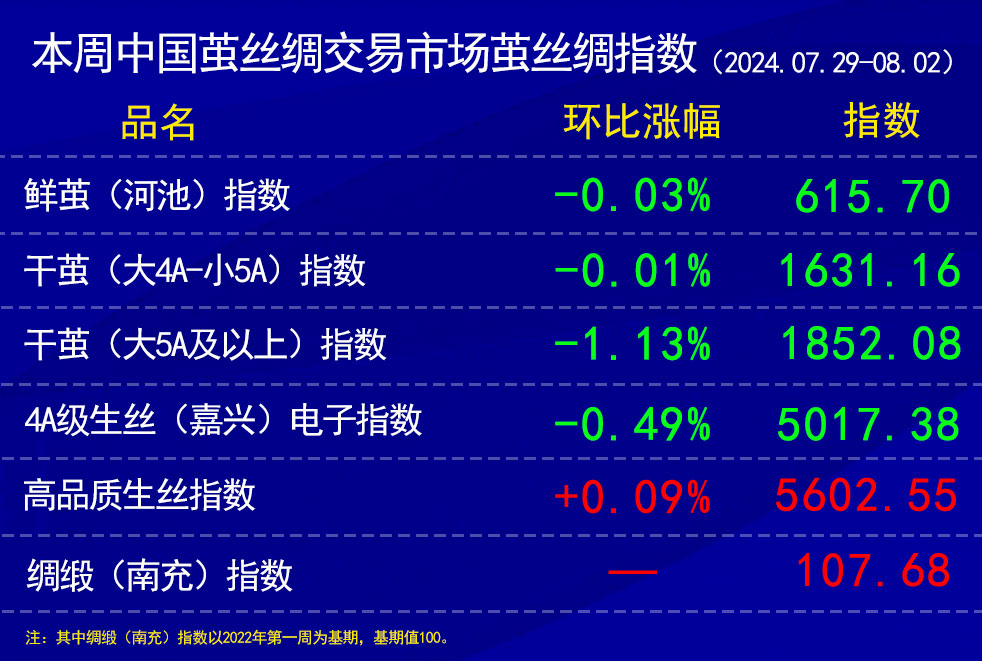 本周中國(guó)繭絲綢交易市場(chǎng)繭絲綢指數(shù)