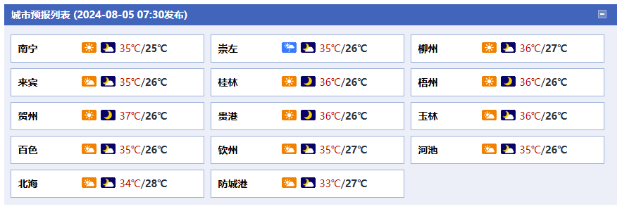 廣西:全區(qū)大部最高氣溫全區(qū)大部最高氣溫34~36℃ 局地37℃以上34~36℃ 局地37℃以上