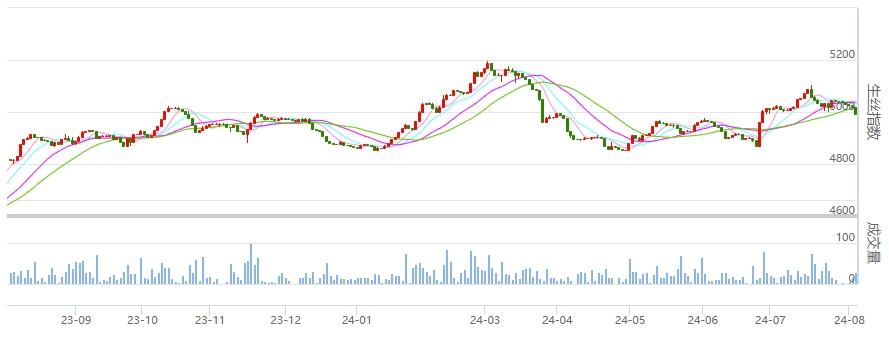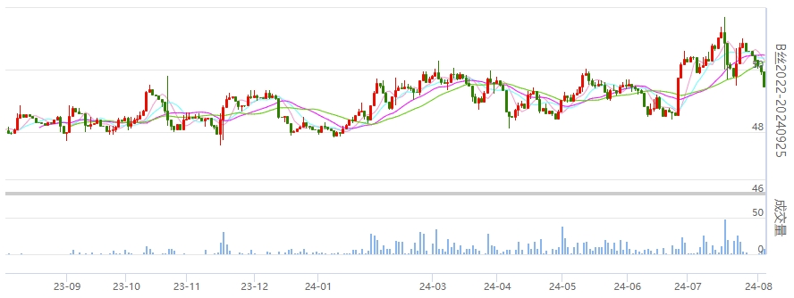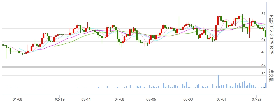 今日(2024年08月05日,周一)中國繭絲綢交易市場生絲電子指數(shù)下跌0.49%報4992.88點。B絲2022D(商檢4A級生絲):240825合約下跌0.03萬元報收于50.61萬元;240925合約下跌0.48萬元報收于49.47萬元;250325合約下跌0.51萬元報收于49.32萬元。