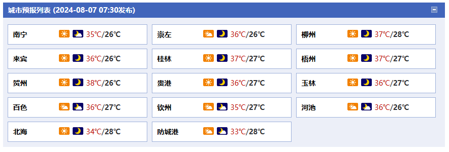 8日白天到晚上,桂西多云有分散陣雨或雷雨、局地大雨,桂東多云到晴、局地有陣雨。最高氣溫:全區(qū)大部34~36℃、局地37℃以上。