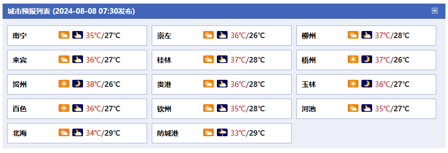 9日白天到晚上,桂北和沿海地區(qū)多云有陣雨或雷雨、局地大雨,其它地區(qū)多云有分散陣雨或雷雨。最高氣溫:全區(qū)大部35~37℃、局地38℃以上。