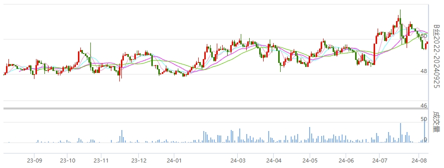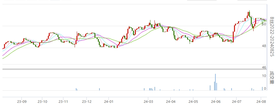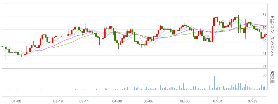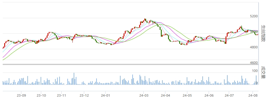 今日(2024年08月08日,周四)中國繭絲綢交易市場生絲電子指數(shù)微漲0.05%報4988.48點。B絲2022D(商檢4A級生絲):240825合約報平收于50.46萬元;240925合約上漲0.12萬元報收于49.86萬元;250325合約上漲0.03萬元報收于49.65萬元。