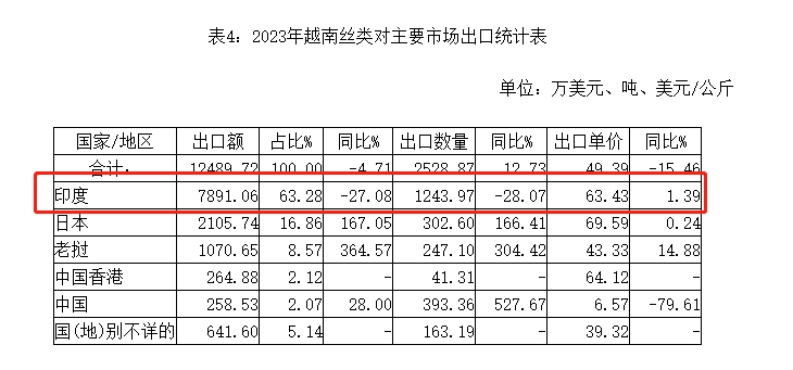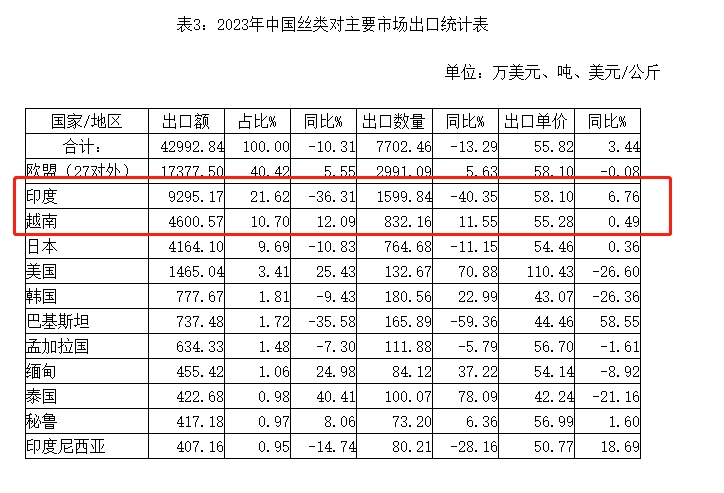 這是2023年印度絲類對主要市場出口統(tǒng)計表(據(jù)GTF數(shù)據(jù))。