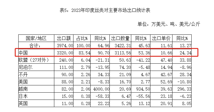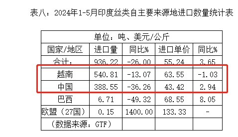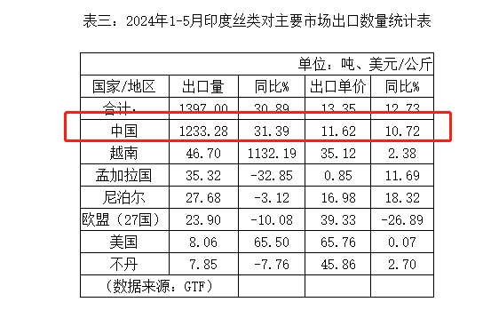 這是2024年1-5月印度絲類對主要市場出口數(shù)量統(tǒng)計表(印度商工部統(tǒng)計)