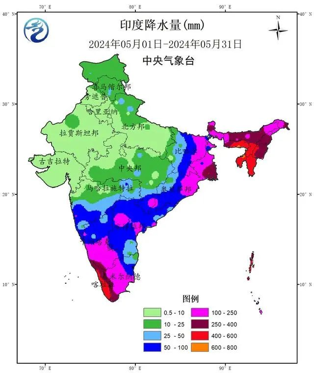 5月,印度降水主要集中在印度東北部和南部,降雨量普遍有50~250毫米,局部250~400毫米,為農(nóng)業(yè)提供了充足的水分條件。