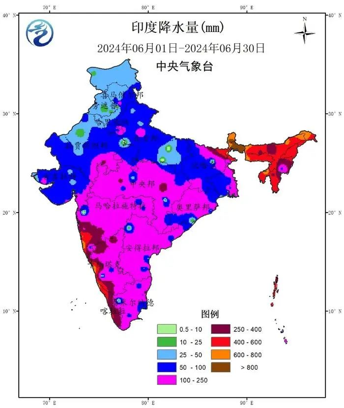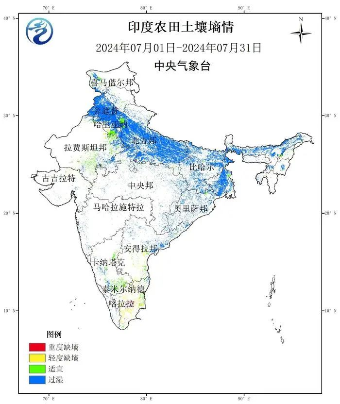 6月,印度中央邦、奧里薩邦、馬哈拉施特拉、安得拉邦、卡納塔克和泰米爾納德等中南部地區(qū)氣溫接近常年同期,降水有100~250毫米,利于農(nóng)作物生長。