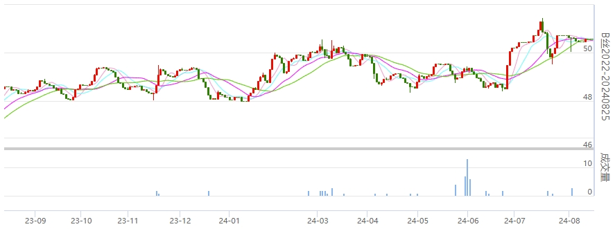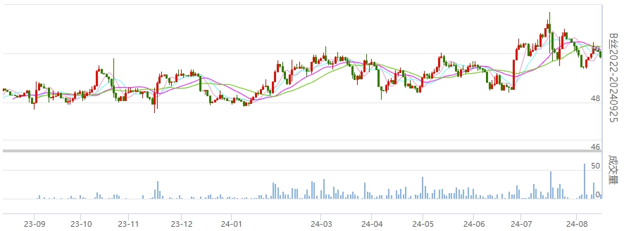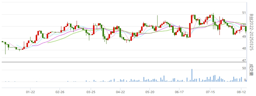 今日(2024年08月15日,周四)中國繭絲綢交易市場(chǎng)生絲電子指數(shù)下跌0.20%報(bào)4995.66點(diǎn)。B絲2022D(商檢4A級(jí)生絲):240825合約報(bào)平收于50.58萬元;240925合約下跌0.24萬元報(bào)收于49.86萬元;250325合約下跌0.42萬元報(bào)收于49.59萬元。