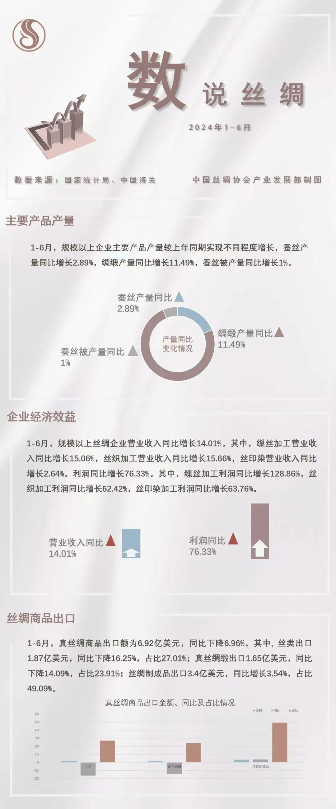中絲協(xié)根據(jù)國家統(tǒng)計(jì)局對(duì)2024年上半年的行業(yè)統(tǒng)計(jì)數(shù)據(jù)顯示,繅絲企業(yè)的利潤同比增長率在子行業(yè)中繼續(xù)居于首位, 表明在對(duì)后期保證原料生產(chǎn)的考慮上,應(yīng)該仍是屬于首當(dāng)其沖的任務(wù)。而綢緞產(chǎn)量同比增長11.49%,下半年仍有去庫存的壓力;同時(shí),蠶絲被產(chǎn)量同比增長只1%,家紡消費(fèi)仍顯不足。