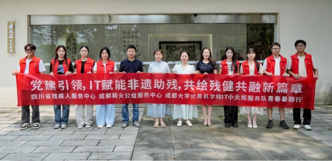 成都大學計算機學院IT小火炬服務(wù)隊主要由學生黨員、預(yù)備黨員、入黨積極分子組成,是學院黨建育人實踐隊伍,于2023年獲評校級志愿服務(wù)隊?!包h建引領(lǐng),IT賦能非遺助殘”主題社會實踐活動,旨在運用計算機技術(shù),感受非遺文化、品味非遺藝術(shù)品、宣傳殘疾人勵志故事,為非遺助殘貢獻青春力量的同時,激勵廣大學子爭當新時代好青年。這一期是“蜀繡助殘”,明天我們還有“羌秀助殘”的直播活動,并結(jié)合實地調(diào)研成果,開發(fā)一款具有非遺特色的殘疾人社交APP,將專業(yè)知識運用到實際生活中,助力殘健共融。