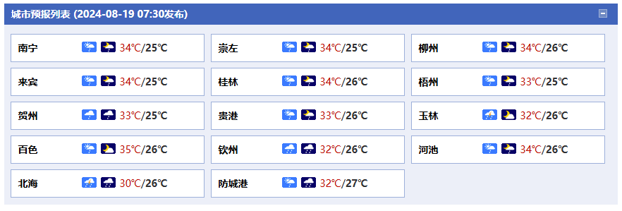 預計,今天白天(19日),桂南和沿海的部分地區(qū)將有中雨,局地大雨到暴雨,并伴有短時雷暴大風等強對流天氣。最高氣在30~34℃,左右江河谷局地可能出現(xiàn)35℃以上高溫天氣。