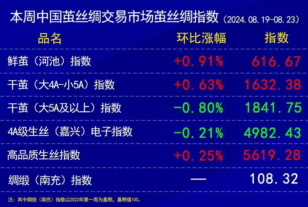 今日(2024年08月23日,周五)中國繭絲綢交易市場生絲電子指數(shù)報平收于4982.43點,本周生絲指數(shù)下跌0.21%。B絲2022D(商檢4A級生絲):240825合約報平收于50.58萬元;240925合約上漲0.06萬元報收于50.04萬元;250325合約上漲0.12萬元報收于49.59萬元。