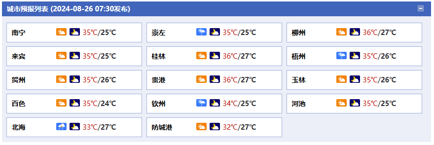 27日白天到晚上,桂東北和沿海部分地區(qū)有小到中雨、局地大雨到暴雨并伴有短時雷暴大風(fēng)等強(qiáng)對流天氣,其它地區(qū)多云有分散陣雨或雷雨。最高氣溫:全區(qū)大部35~36℃、局地37℃以上。