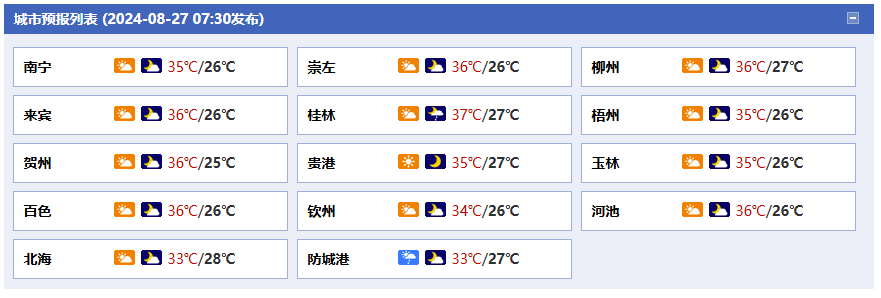 28日白天到晚上,桂北、桂東部分地區(qū)有中到大雨、局地暴雨并伴有短時雷暴大風等強對流天氣,其它地區(qū)多云有分散陣雨或雷雨、局地中到大雨。最高氣溫:桂西、桂南34~36℃、局地37℃以上,其它地區(qū)30~34℃。