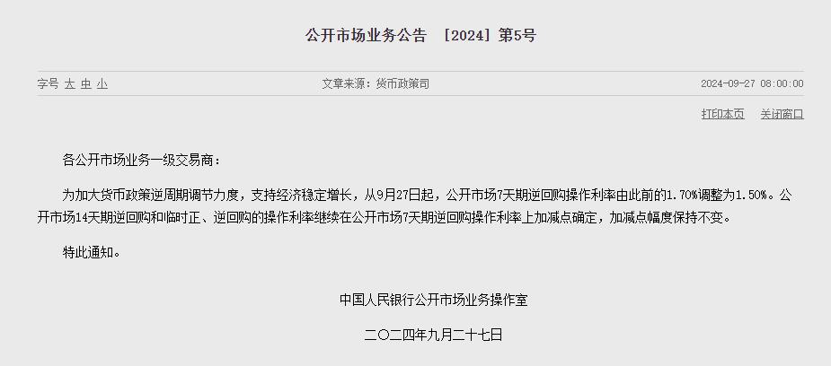 央行:9月27日起公開市場7天期逆回購操作利率由此前的1.70%調(diào)整為1.50%
