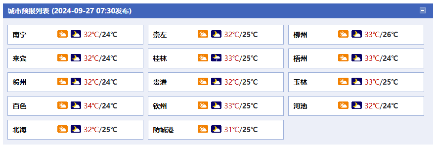 27日白天到晚上,桂東北部分地區(qū)多云有陣雨或雷雨,其它地區(qū)多云、局地陣雨。