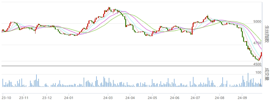 今日央行宣布今起降準(zhǔn)0.5個(gè)百分點(diǎn)。在政策面繼續(xù)加碼下,股票市場(chǎng)繼續(xù)漲勢(shì)如虹,市場(chǎng)情緒燃爆,上交所市場(chǎng)委托量太大,以至于交易系統(tǒng)出現(xiàn)異常;大宗商品大面積飄紅。宏觀層面利好下,今日生絲繼續(xù)飄紅。