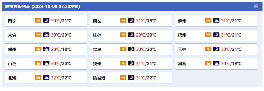 10日白天到11日晚上,全區(qū)多云到晴,其中桂西北局地有陣雨。