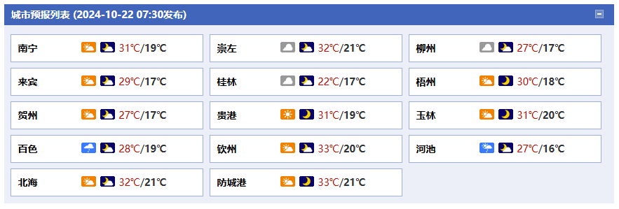 23日白天到晚上,全區(qū)多云到晴。桂東及沿海地區(qū)有5級、陣風(fēng)7~8級偏北風(fēng)。各地氣溫:桂北8~28℃,桂南16~29℃。24日白天到晚上,全區(qū)多云到晴。各地氣溫:桂北8~30℃,桂南16~32℃。
