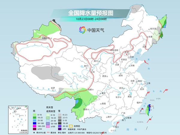 明天,新疆北部阿勒泰山區(qū)和天山山區(qū)、內蒙古東北部、黑龍江西北部和東南部、吉林東部、西藏東部和北部、青海南部等地部分地區(qū)有小到中雪或雨夾雪,其中,新疆北部阿勒泰山區(qū)等地部分地區(qū)有大到暴雪。黑龍江東部、吉林東北部、云南西北部、臺灣島大部等地部分地區(qū)有中到大雨,其中,臺灣島北部和東部等地部分地區(qū)有暴雨或大暴雨(100~150毫米)。