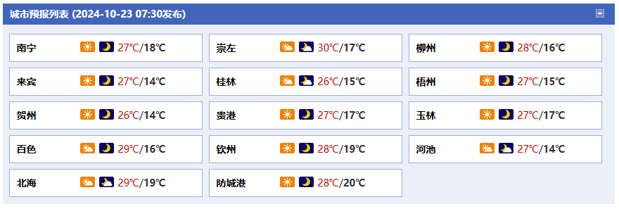 今天白天到晚上,全區(qū)多云到晴。桂東及沿海地區(qū)有5級、陣風7~8級偏北風。各地氣溫:高寒山區(qū)8~22℃,桂北13~27℃,桂南16~29℃。