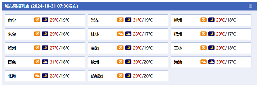 11月1日白天到晚上,全區(qū)晴間多云。桂東和沿海部分地區(qū)有偏北風5級、陣風6~7級。