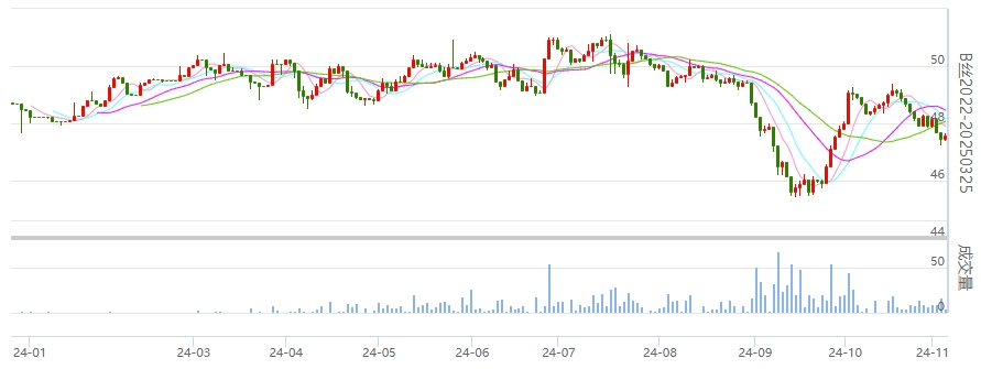 20/22D商檢4A級(jí)生絲:今日(周三)生絲指數(shù)稍有回升但仍收于主要均線下方,盤(pán)面各遠(yuǎn)近合約價(jià)格各有漲跌,主力合約250325持倉(cāng)量有所增加。