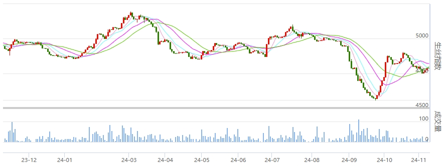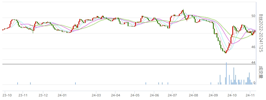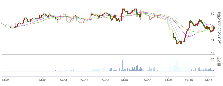 今日(2024年11月11日,周一)中國(guó)繭絲綢交易市場(chǎng)生絲電子指數(shù)微跌0.04%收于4788.37點(diǎn)。B絲2022D(商檢4A級(jí)生絲):241125合約上漲0.03萬元報(bào)收于48.30萬元;250325合約下跌0.24萬元報(bào)收于47.94萬元;250925合約報(bào)平收于47.61萬元。