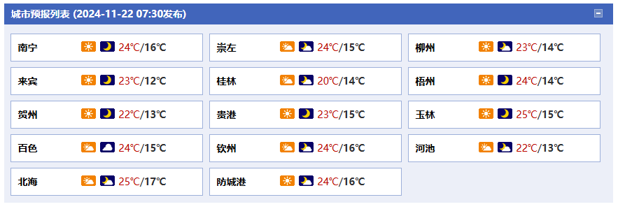 23日白天到晚上,全區(qū)多云到晴,其中桂北局地有小雨。