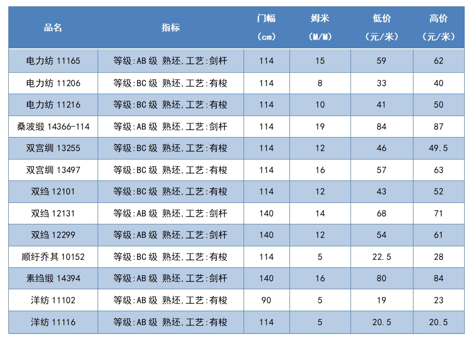 本周綢緞指數(shù)協(xié)作單位成交價格區(qū)間